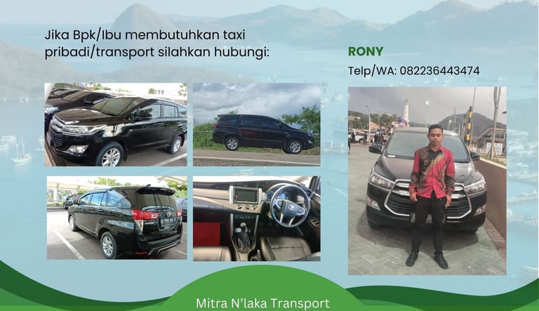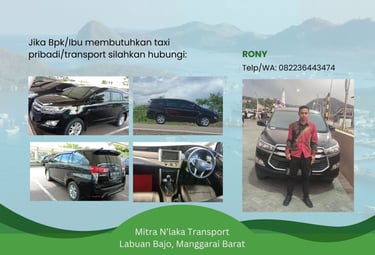 N'Laka Transport menyediakan layanan jasa transportasi (taxi pribadi) di Labuan Bajo. Kami melayani antar-jemput penumpang untuk jarak dekat (dalam kota) maupun jarak menengah-jauh (antar kota/kabupaten di daratan pulau Flores). Kami menyediakan mobil yang prima (Inova, Avanza, dan lain-lain) dengan layanan yang prima dan terpercaya.